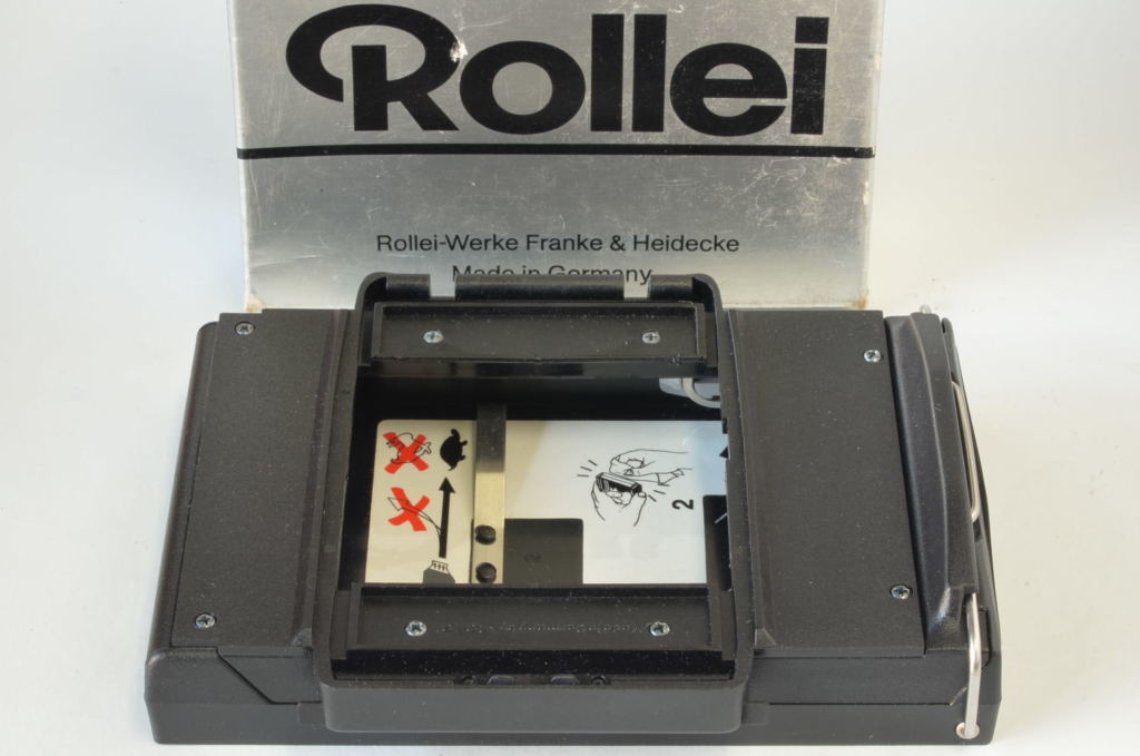 Adattatore Polaroid originale per sistema medio formato Rolleiflex SLX, prodotto in collaborazione da Rollei e Polaroid nella seconda metà degli anni Settanta. Questo accessorio permette di utilizzare pellicole a sviluppo istantaneo serie 100 utilizzando il corpo macchina professionale Rolleiflex, ideale per testare l’esposizione o per progetti creativi artistici. Nuovo, completo di scatola e istruzioni originali.