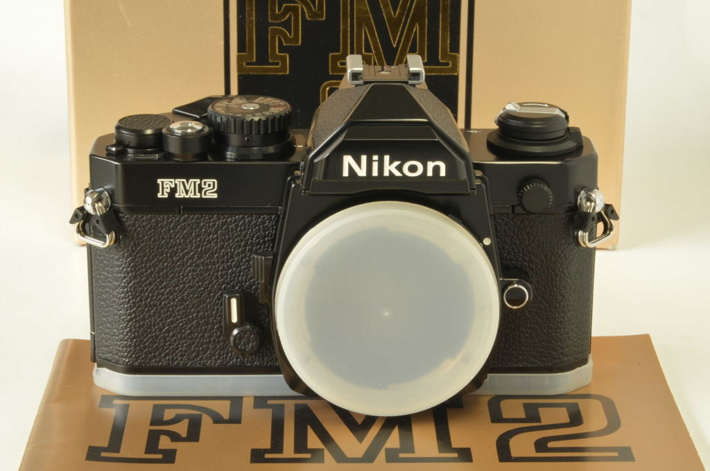 Nikon FM2, formato 24×36, evoluzione della precedente fotocamera Nikon FM con evidenti migliorie. Versione transitiva ancora con l’eccellente otturatore in titanio a nido d’ape, che raggiunge la velocità di 1/4000 di secondo e con syncro flash a 1/250. Nuova, inusata, difficile da reperire in tali condizioni in configurazione nera. Completa di imballo originale.