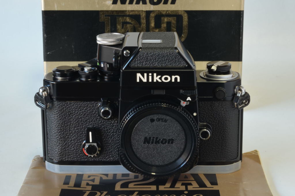 Progettata dal noto designer Giorgetto Giugiaro, è la prima Nikon professionale con esposimetro incorporato nel corpo macchina e automatismo di esposizione, ancora oggi un’analogica di riferimento per amatori e professionisti. Versione base in configurazione non HP (High Eyepoint). In ottime condizioni, leggeri segni d’uso. Completa di scatola.