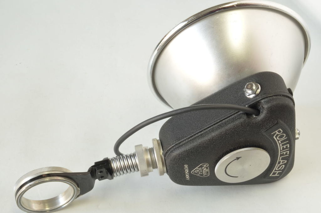 Rolleiflash per fotocamere biottiche (TLR) Rolleiflex e Rolleicord prodotto alla fine deglia anni Cinquanta dalla casa tedesca Franke & Heidecke. Questo flash è famoso per il suo design ingegnoso che si aggancia direttamente alla baionetta dell’obiettivo di visione (la lente superiore), mantenendo il setup compatto ed elegante. Molto bello, completo di lampada inutilizzata.
