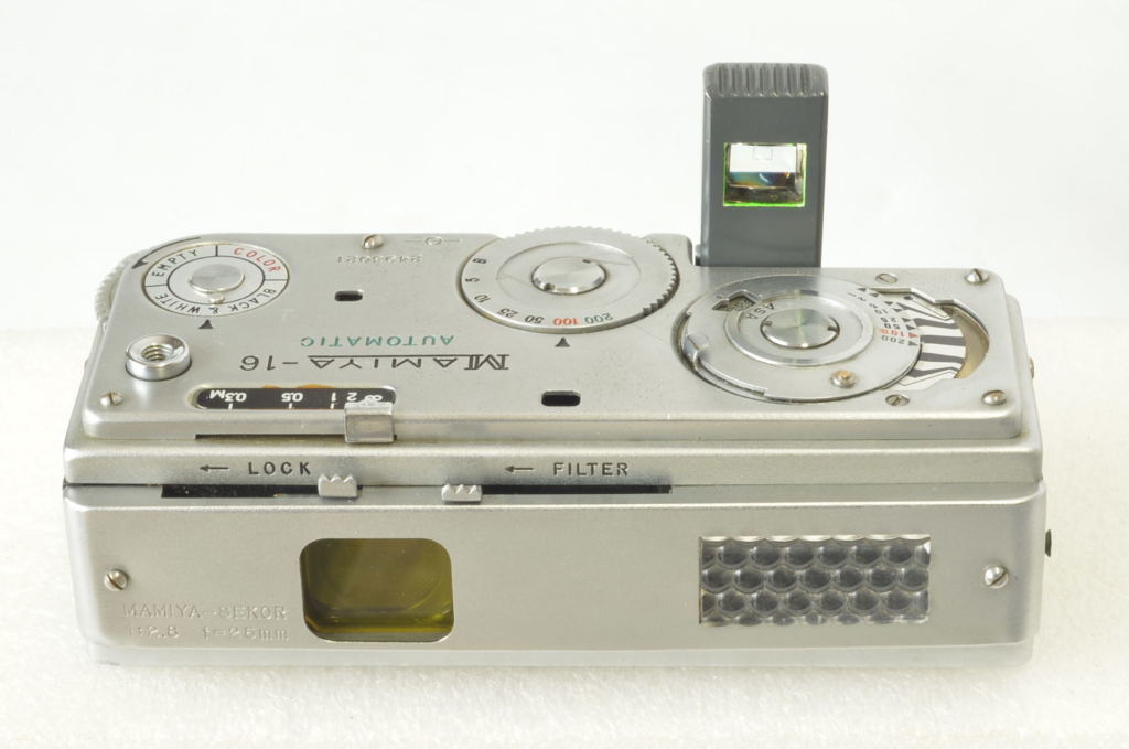 Fotocamera subminiature Mamiya-16 Automatic, un vero pezzo di storia della fotografia “spy” giapponese prodotta intorno al 1959. Questa fotocamera utilizza pellicola formato 16mm in appositi caricatori. Molto bella.
