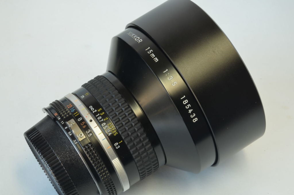 Raro fish-eye Nikon presentato al pubblico nel 1961, sicuramente con l’intenzione di una limitata produzione, considerando il numero seriale a 5 cifre. Costruito con filtri incorporati e inseribili a tamburo rotante, schema ottico composto da 9 elementi in 5 gruppi. Molto bello, completo di tappi originali e mirino DF1.