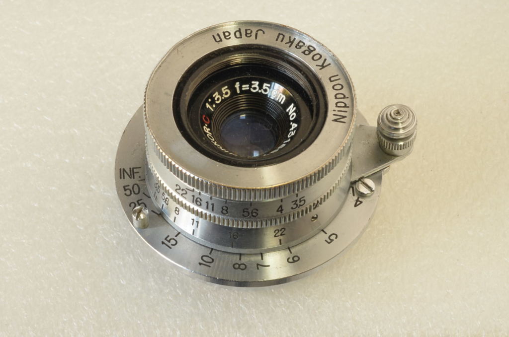 Obiettivo 3.5 cm f/3.5 Japan introdotto sul mercato da Nikon alla fine degli anni Quaranta per fotocamere con passo a vite 39×1 e prodotto in pochi esemplari. Fu subito molto apprezzato dai fotografi professionisti dell’epoca grazie alla sua compattezza e notevoli qualità ottiche. In buone condizioni, completo di tappo posteriore.