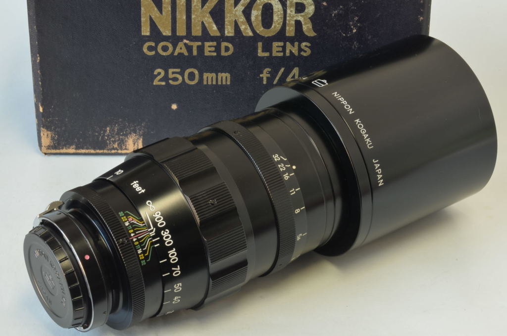 L’obiettivo Nikkor 8.5-25cm è il primo tele zoom prodotto da Nikon, l’esemplare in vendita appartiene al secondo tipo con un’unica ghiera di messa a fuoco e comando zoom, costruito approssimativamente nel 1962. Esteticamente bellissimo, completo di paraluce, tappi originali e lente addizionale. Presenta un’incisione artigianale sul corpo.
