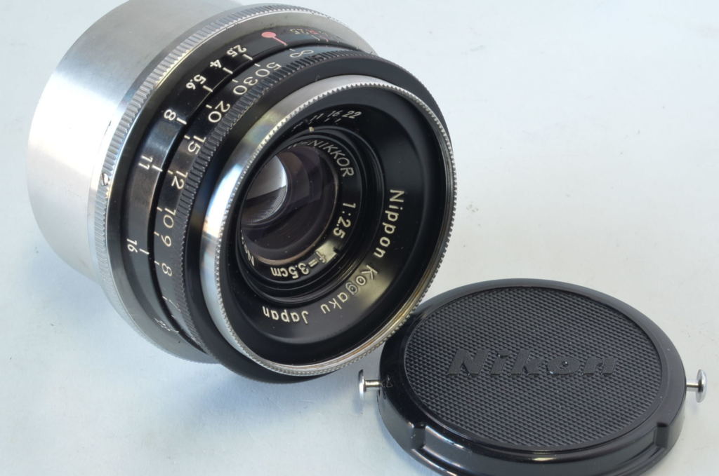 Obiettivo 3.5 cm f/3.5 Japan introdotto sul mercato da Nikon alla fine degli anni Quaranta per fotocamere con passo a vite 39×1 e prodotto in pochi esemplari. Fu subito molto apprezzato dai fotografi professionisti dell’epoca grazie alla sua compattezza e notevoli qualità ottiche. In buone condizioni, completo di tappo posteriore.