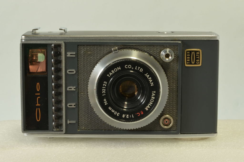 Fotocamera mezzo formato 35mm prodotta in Giappone nel 1961 dalla Taron Co., Ltd. Questo modello è un piccolo gioiello di design meccanico, molto ambito tra i collezionisti di fotocamere giapponesi d’epoca. Essendo una mezzo formato, permette di scattare 72 foto su un normale rullino da 36 pose. Meccanica funzionante, cellula al selenio esaurita.