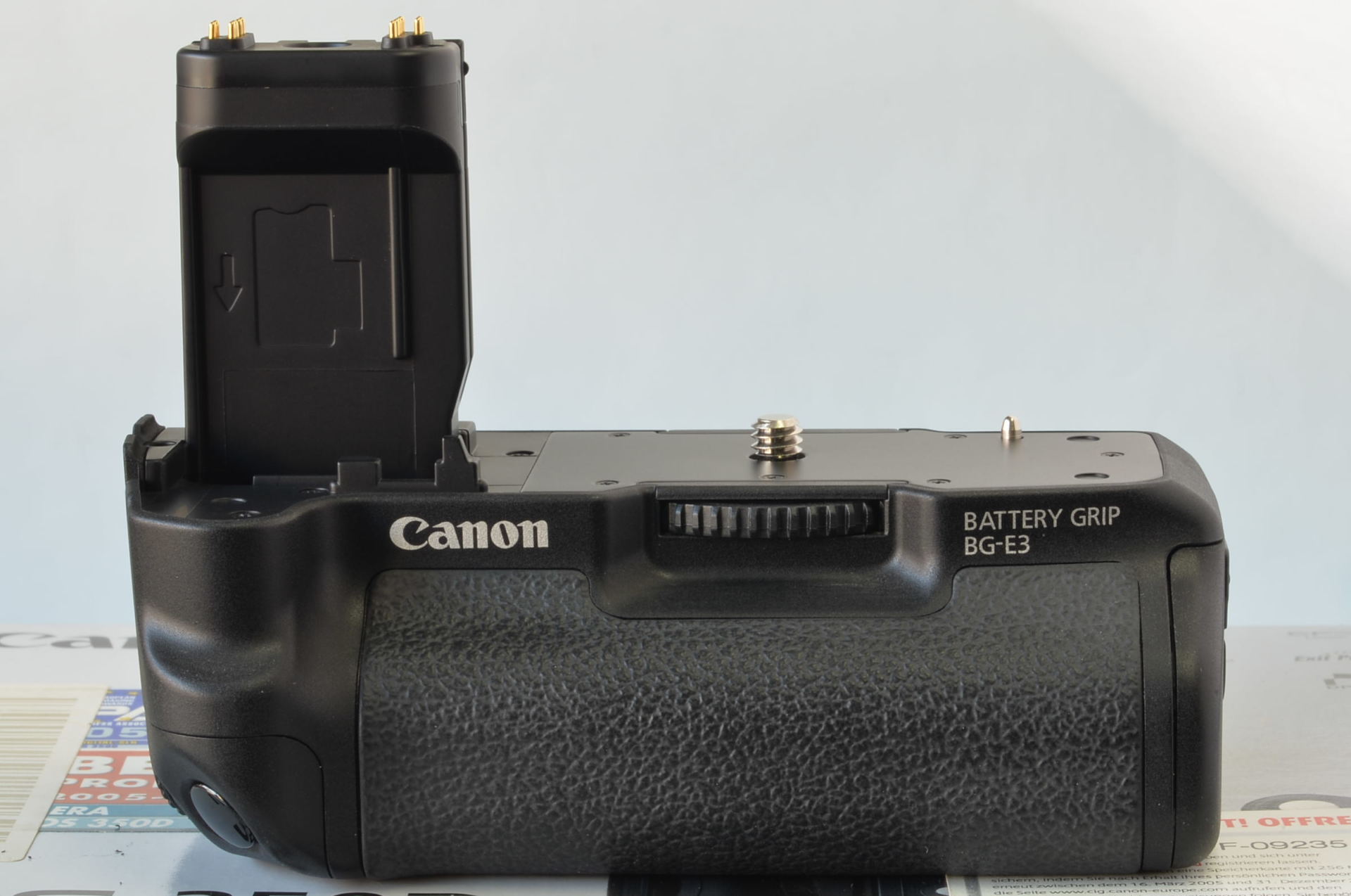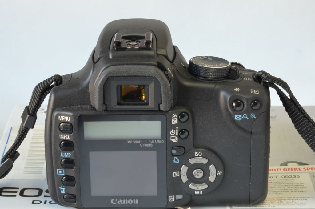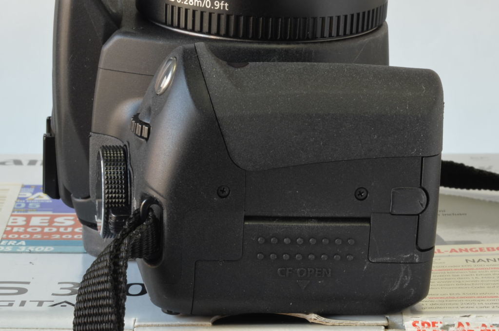 Fotocamera reflex digitale prodotta da Canon a partire dal 2005 come evoluzione della 300D. Le sue caratteristiche principali sono il sensore CMOS da 8.0 Megapixel, lo schermo LCD da 1.8 pollici, l’autofocus a 7 punti e lo scatto continuo a 3 fps. Compatibile con tutti gli obiettivi Canon EF ed EF-S, è qui corredata da un EF-S 18-55mm f/3.5-5.6 USM, con schema ottico composto da 11 elementi suddivisi in 9 gruppi. Completano il kit l’impugnatura portabatteria Canon BG-E3, che aumenta l’autonomia della fotocamera e migliora l’ergonomia, specialmente per gli scatti verticali e tre batterie. Praticamente nuova, con pochissimi scatti, completa di imballo e istruzioni originali.