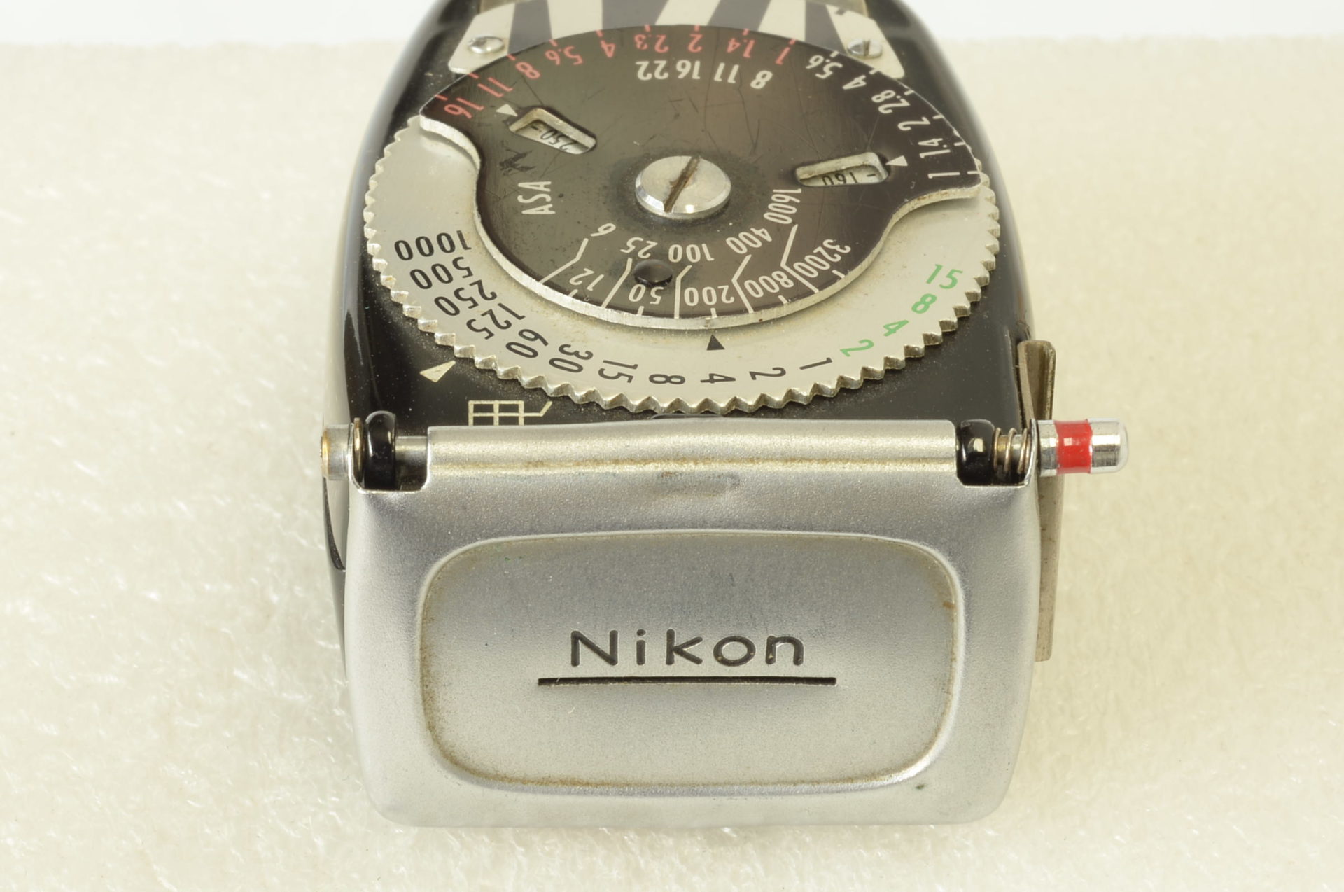 Esposimetro Nikon per le fotocamere a telemetro SP, S3, S4. Permette l’accoppiamento diretto attraverso la ghiera dei tempi che funge da ingranaggio. Completo di booster originale con propria custodia. Cellula esaurita.