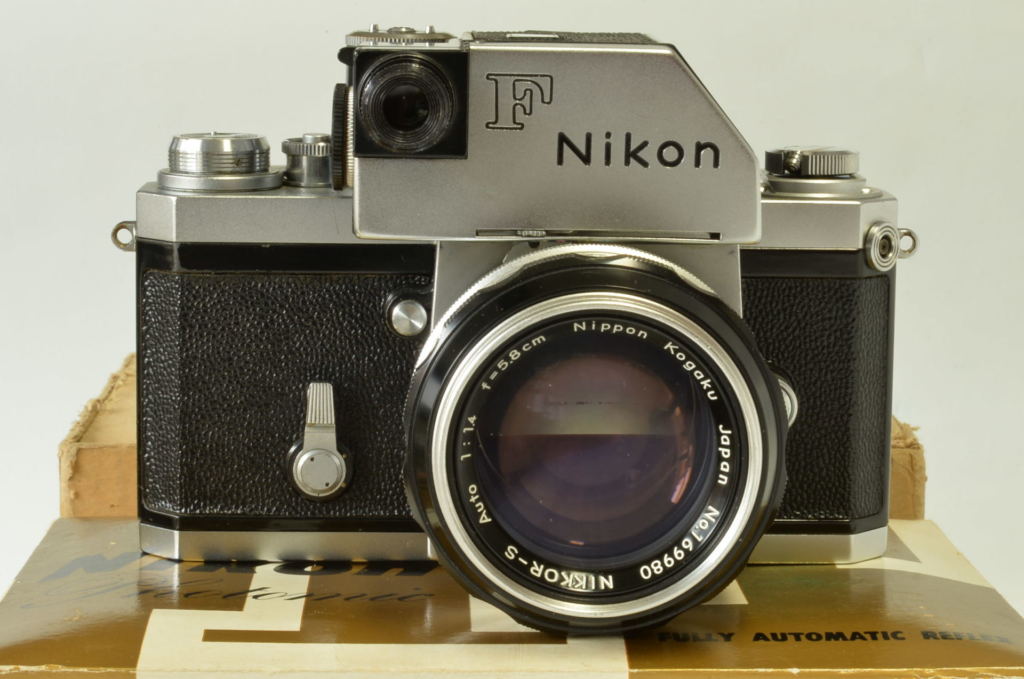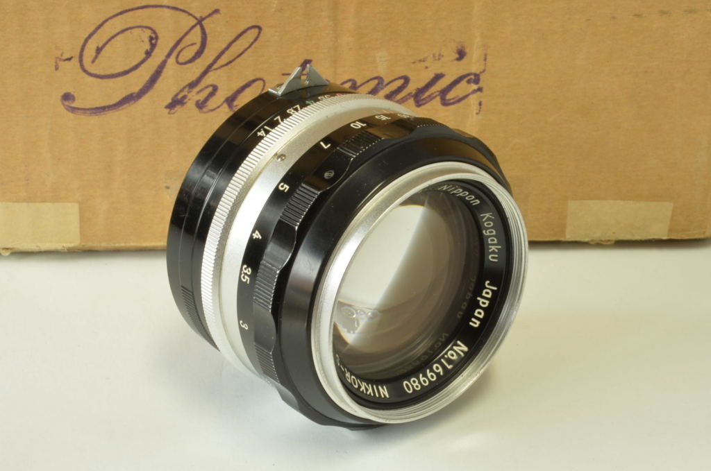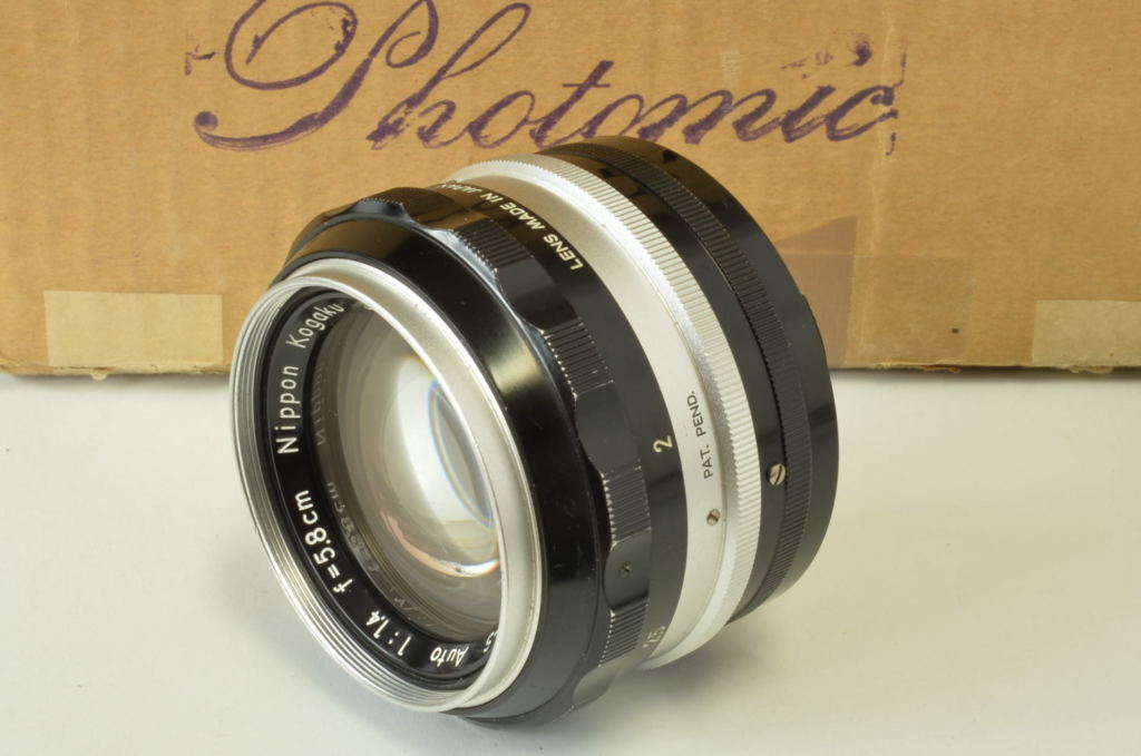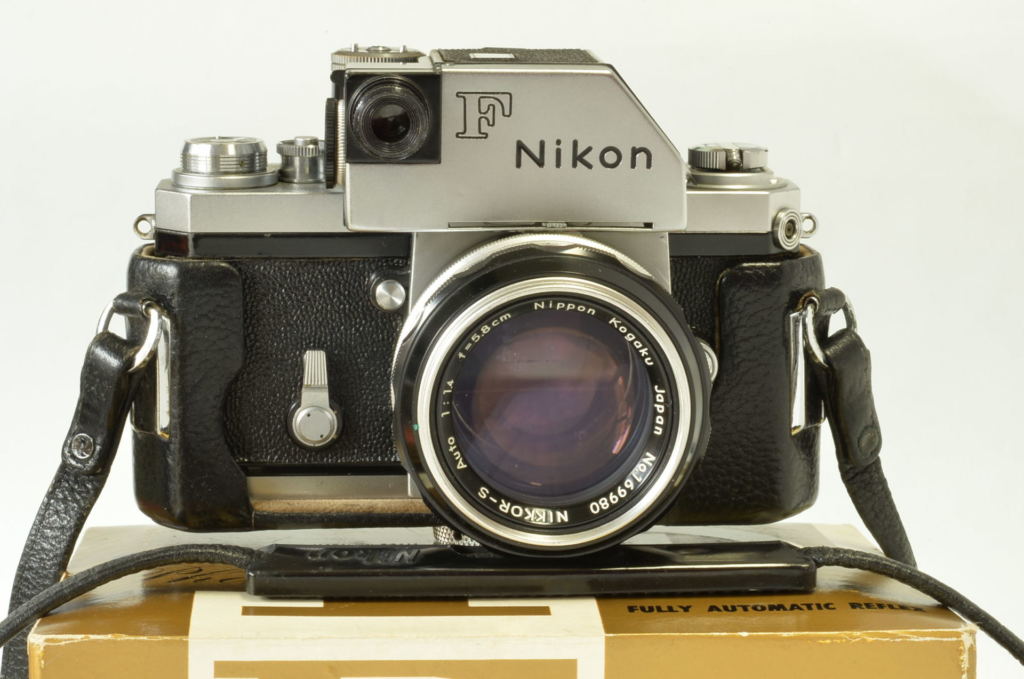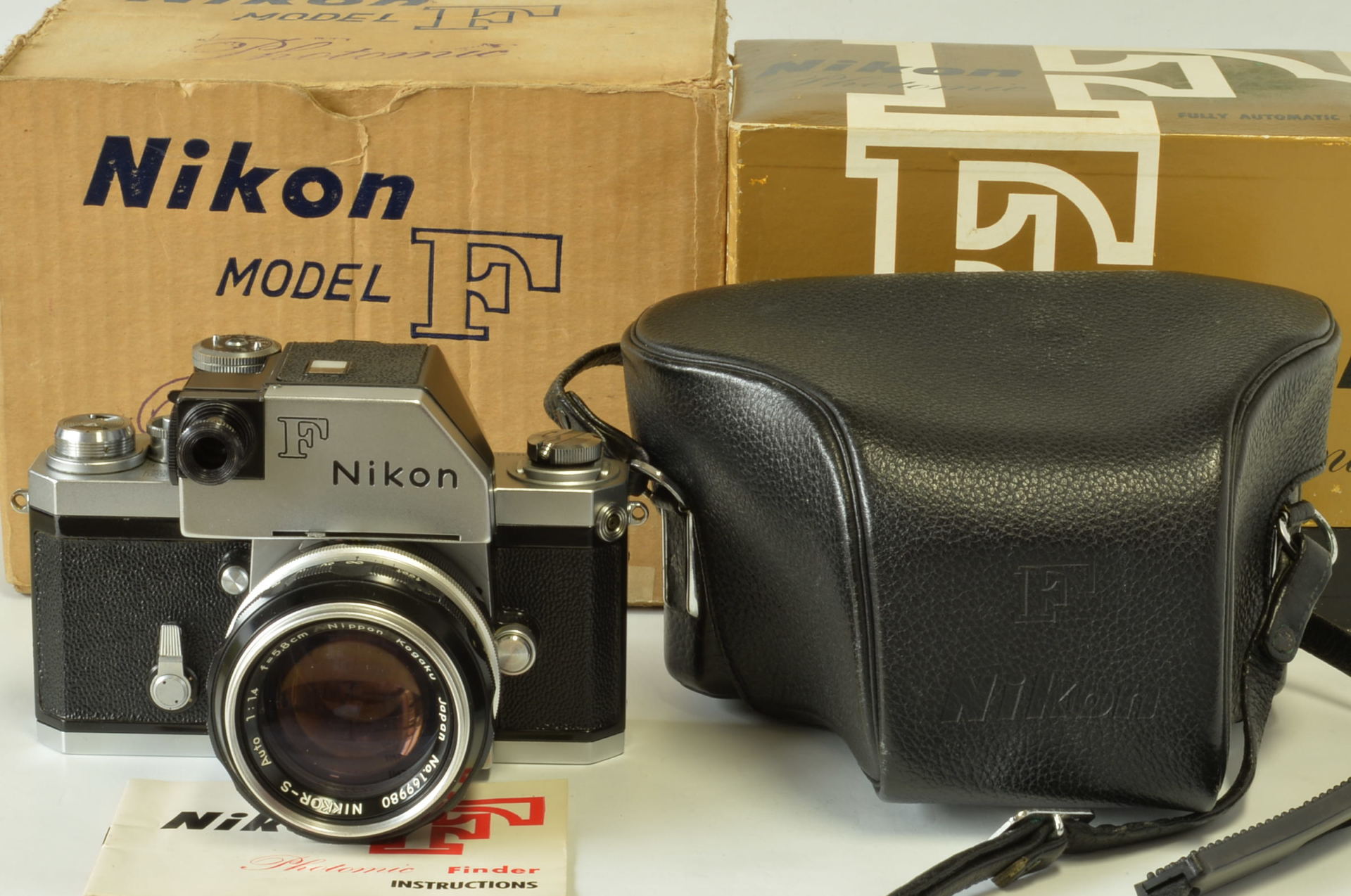 Interessante Nikon F Photomic cromata, completa di obiettivo Nikkor 5.8 cm F/1.4, borsa pronto originale, doppio imballo e istruzioni. Corpo in buonissime condizioni, esposimetro prima versione con accensione a bandiera, funzionante ma non garantiamo la corretta lettura. Obiettivo molto bello, privo di funghi e non modificato. Fotocamera prodotta alla fine del 1961.