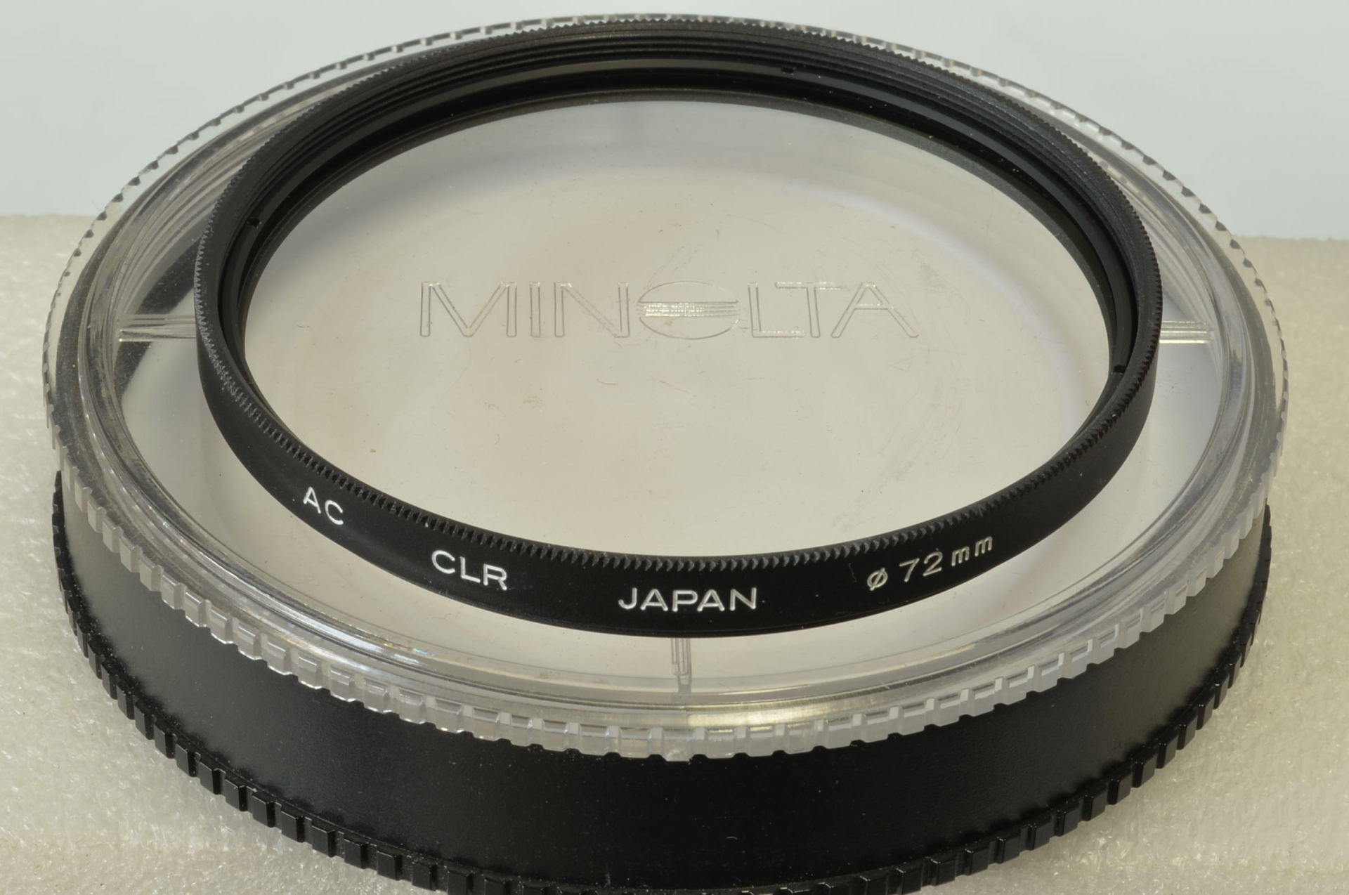 Filtro “Clear” (trasparente) di alta precisione, prodotto in Giappone da Minolta, ideale per proteggere la lente frontale di obiettivi professionali senza alterare la resa cromatica. Include custodia rigida originale Minolta. Come nuovo, utilizzabile su qualunque obiettivo diametro 72mm.