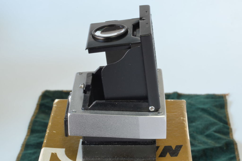 Mirino a pozzetto per Nikon F prima versione, sicuramente la più rara, prodotto dal 1959 al 1964. Bellissimo, completo di imballo, astuccio e velluto protettivo originale.