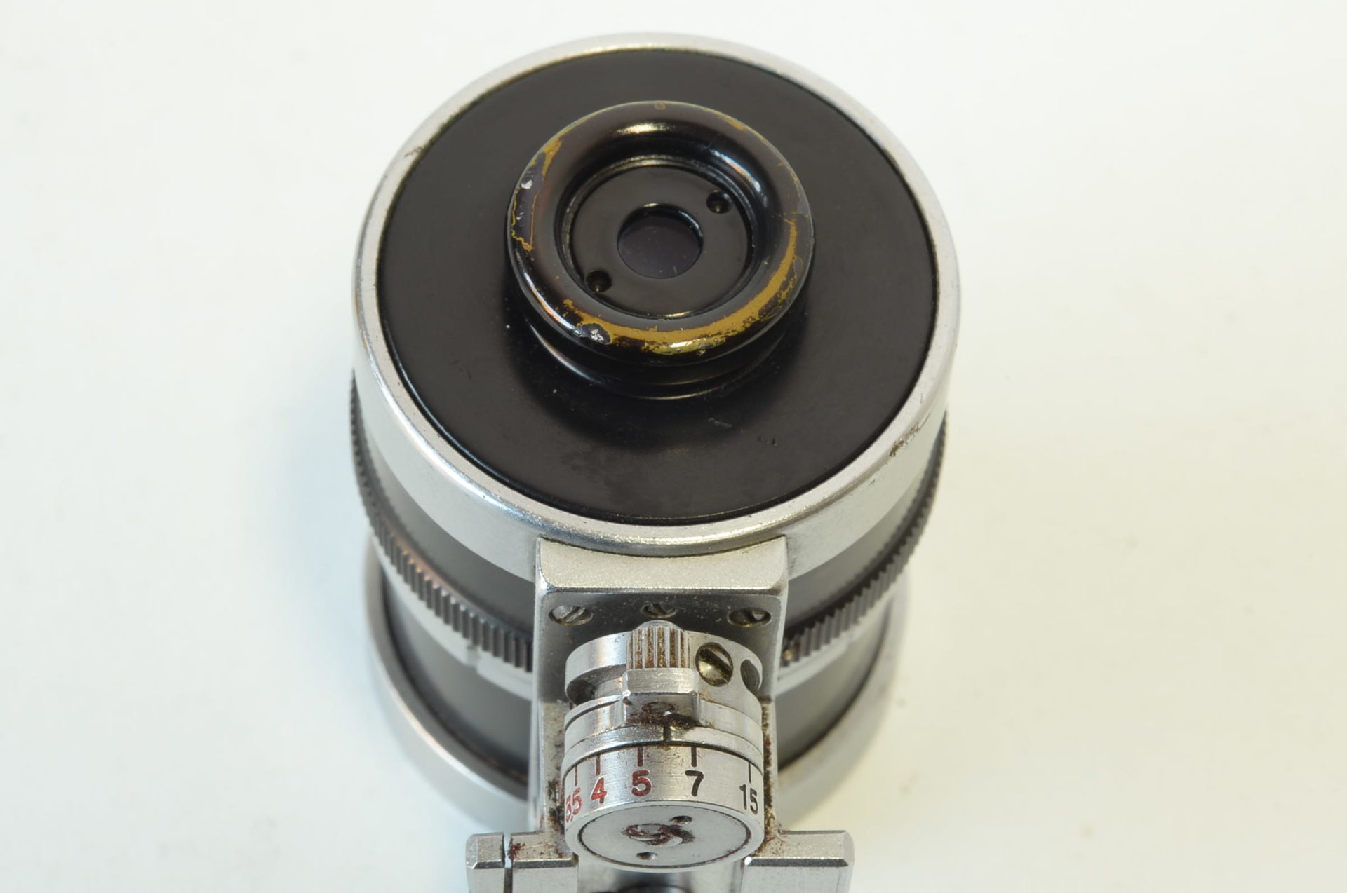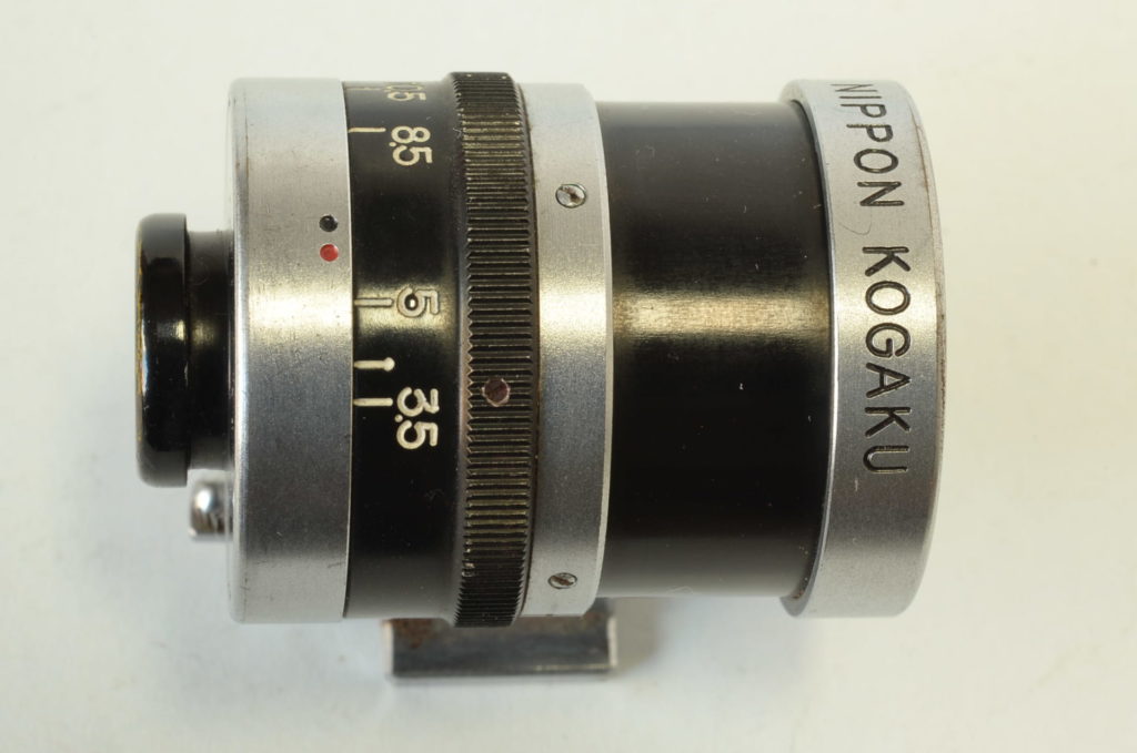 Prima versione di mirino Nikon con zoom ottico, composto da due ghiere: una per la zoomata focale, che oscilla da 3.5cm a 13.5cm e l’altra per la correzione del parallasse. In buone condizioni, completo di cartellina in cuoio.