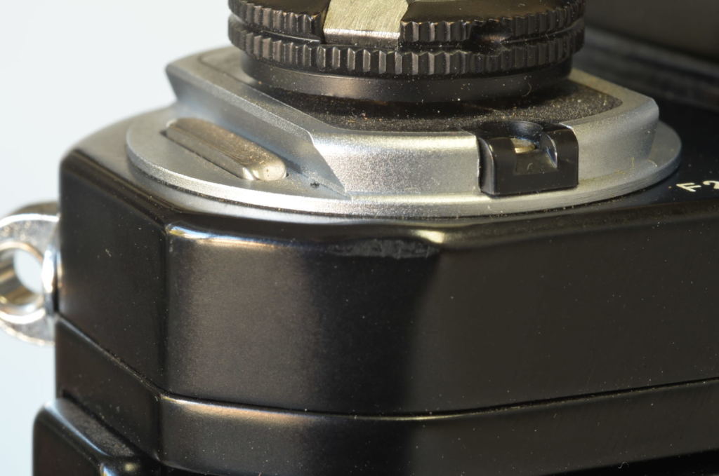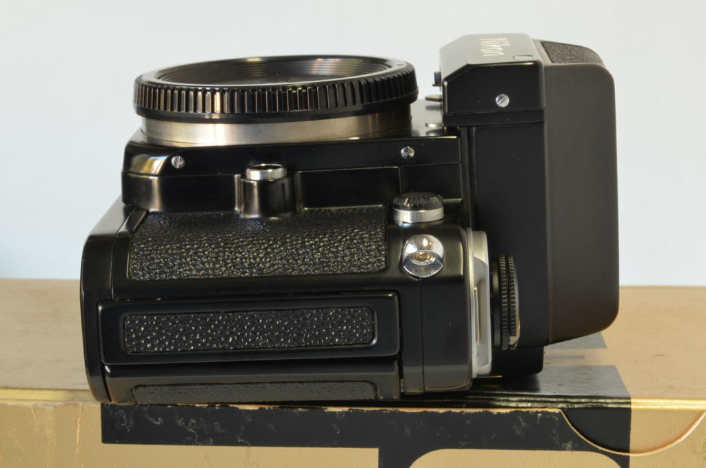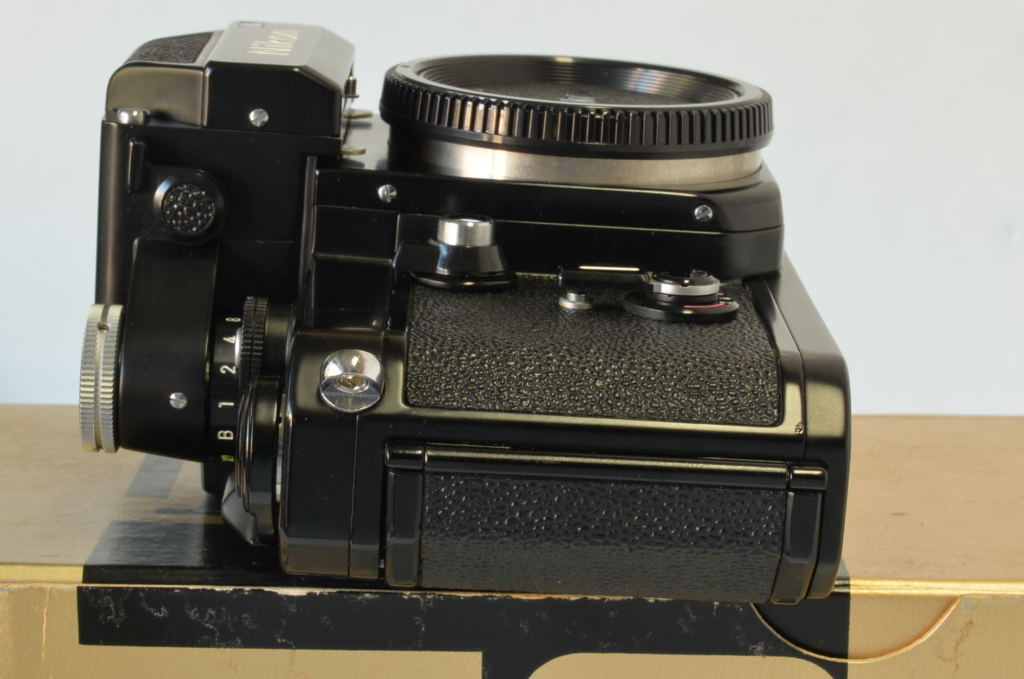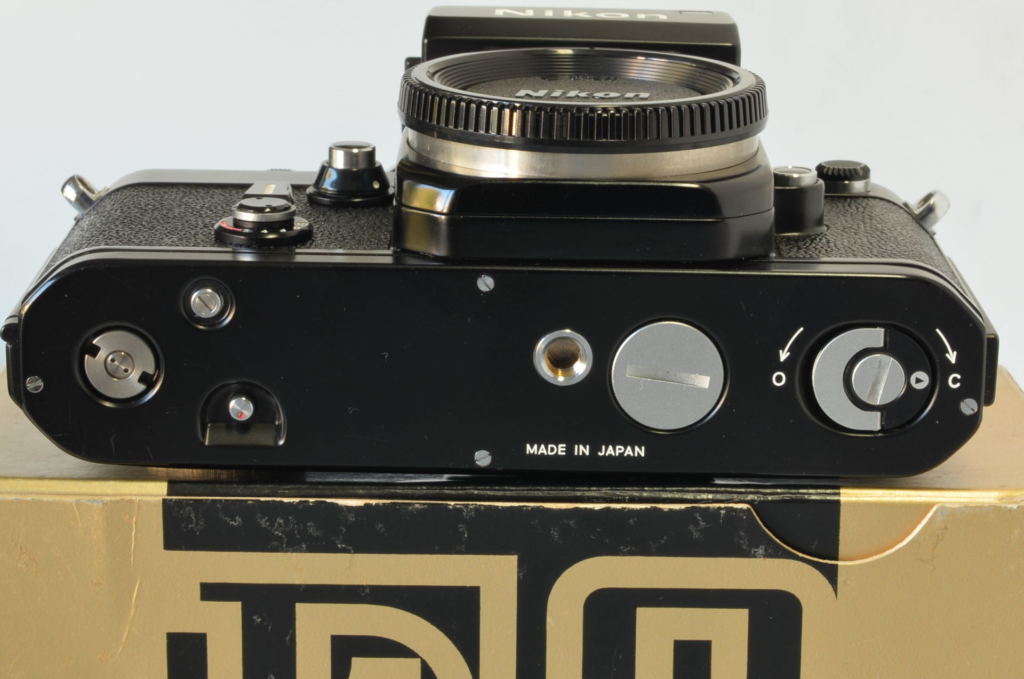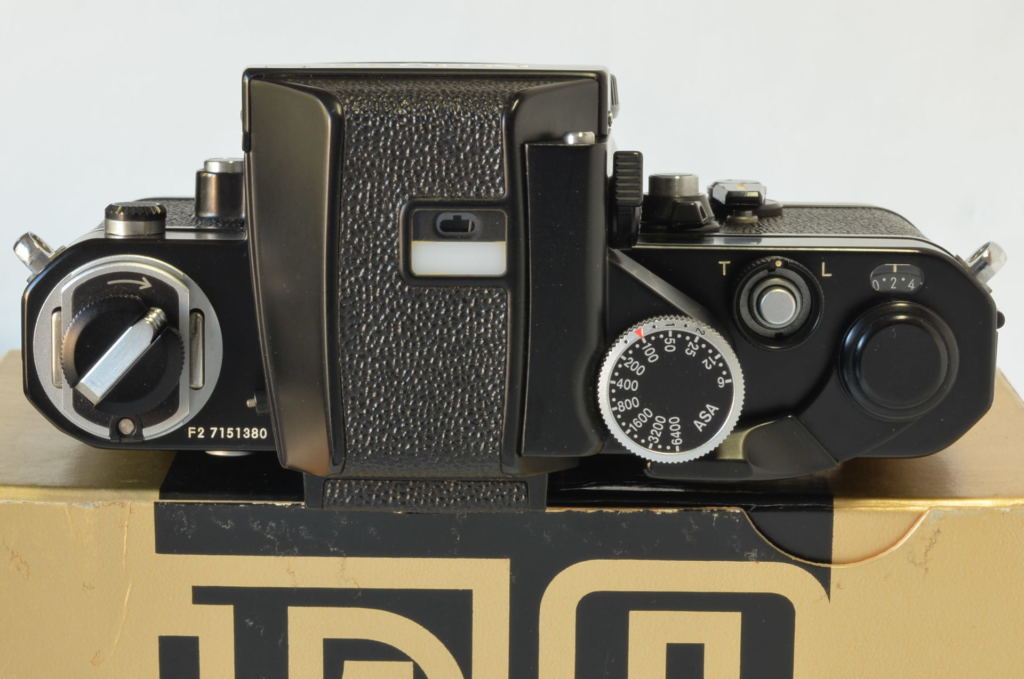 Fotocamera Nikon F2 Photomic DP-1 nella sua primissima versione, prodotta all’incirca nel luglio 1972. Con rivestimento in finta pelle stile Nikon F, più lucida e con trama diversa rispetto alla versione definitiva, viti a taglio e oculare Photomic leggermente diverso. Fotocamera bellissima, di difficilissima reperibilità in tali condizioni, presenta un piccolo urto sul lato sinistro in prossimità del numero seriale. Completa di imballo e istruzioni.