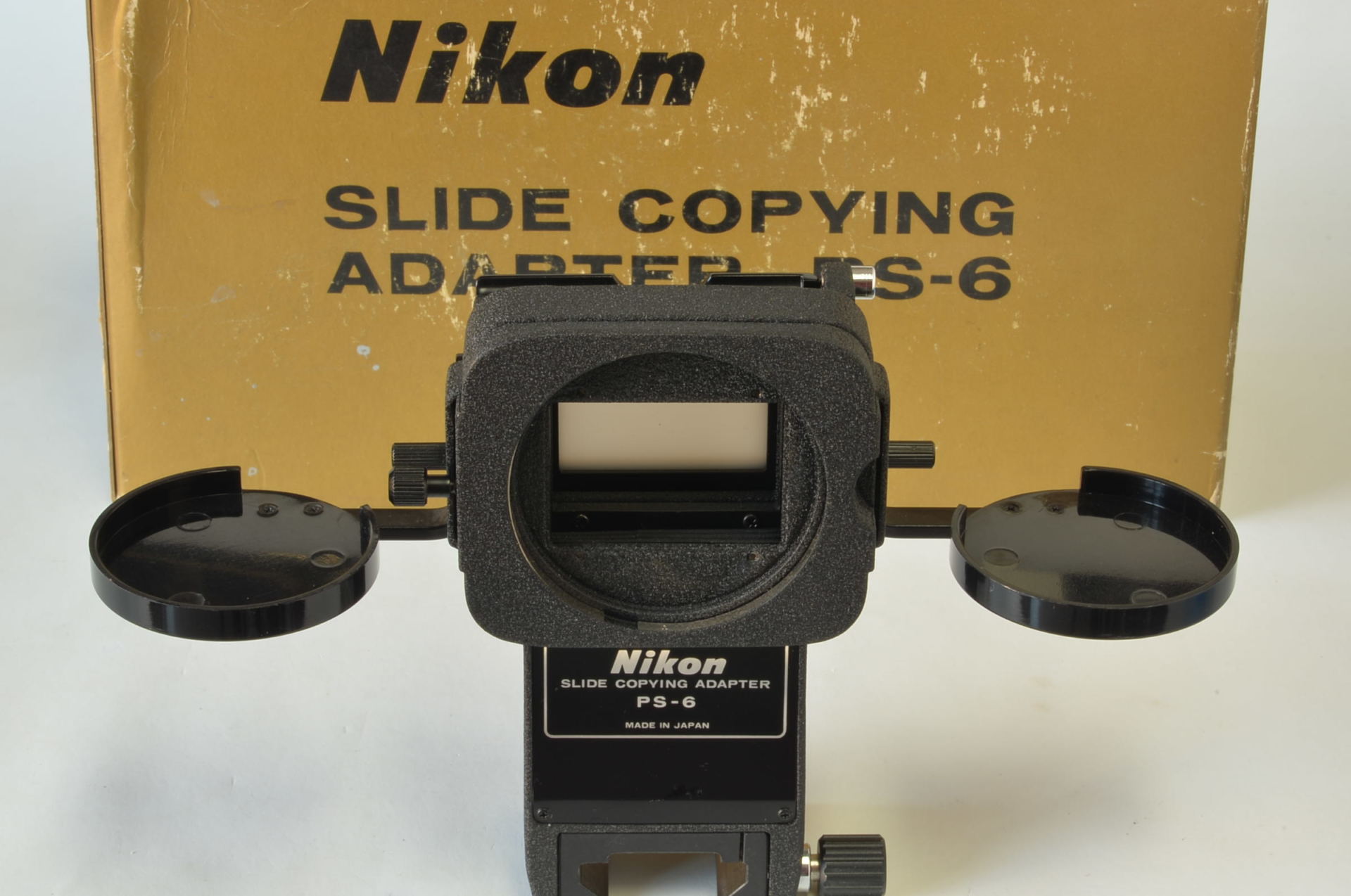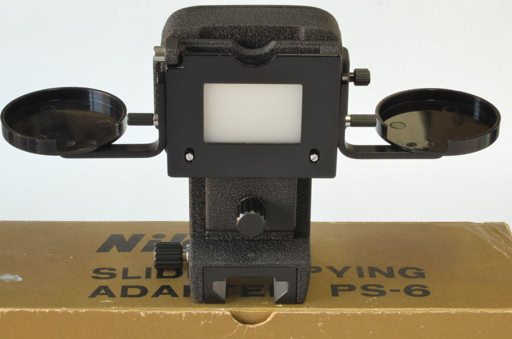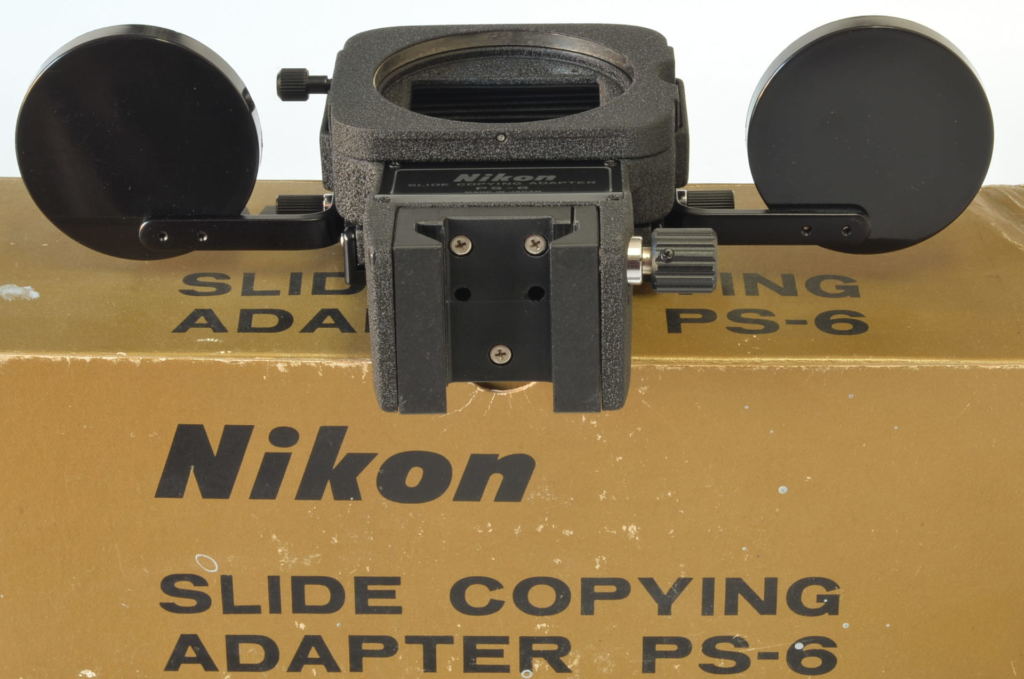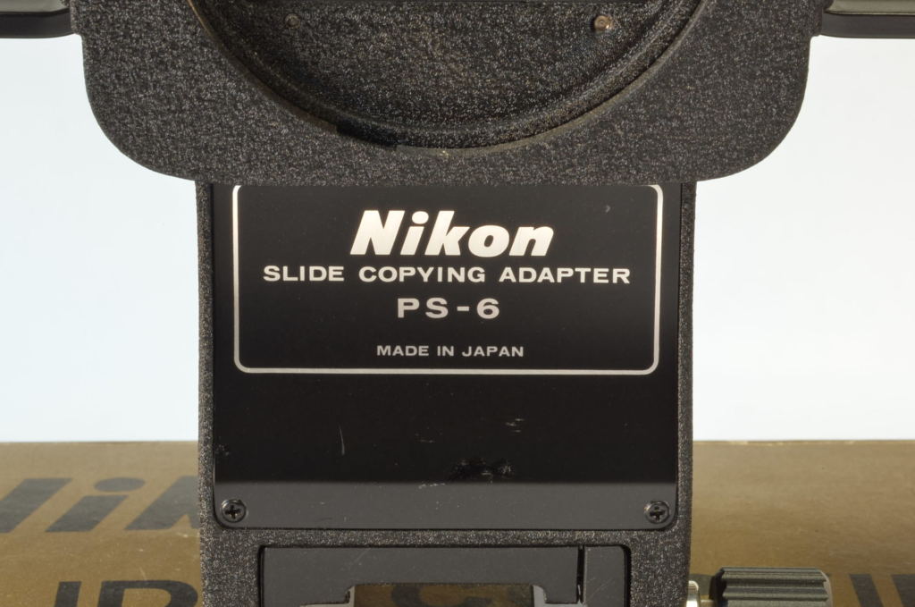 La slitta Nikon PS-6 è un accessorio dedicato al soffietto di estensione Nikon PB-6 per la riproduzione di diapositive e negativi 35mm. Molto bella, completa di imballo originale.