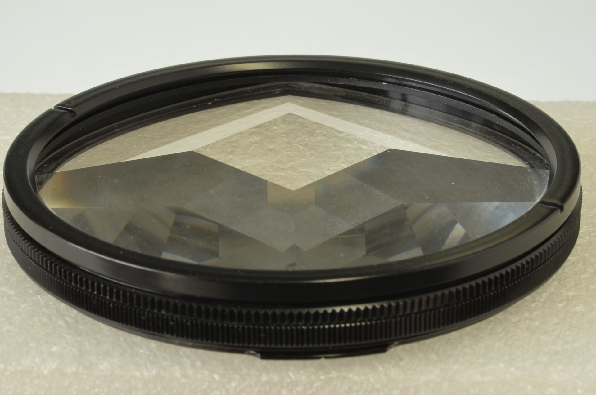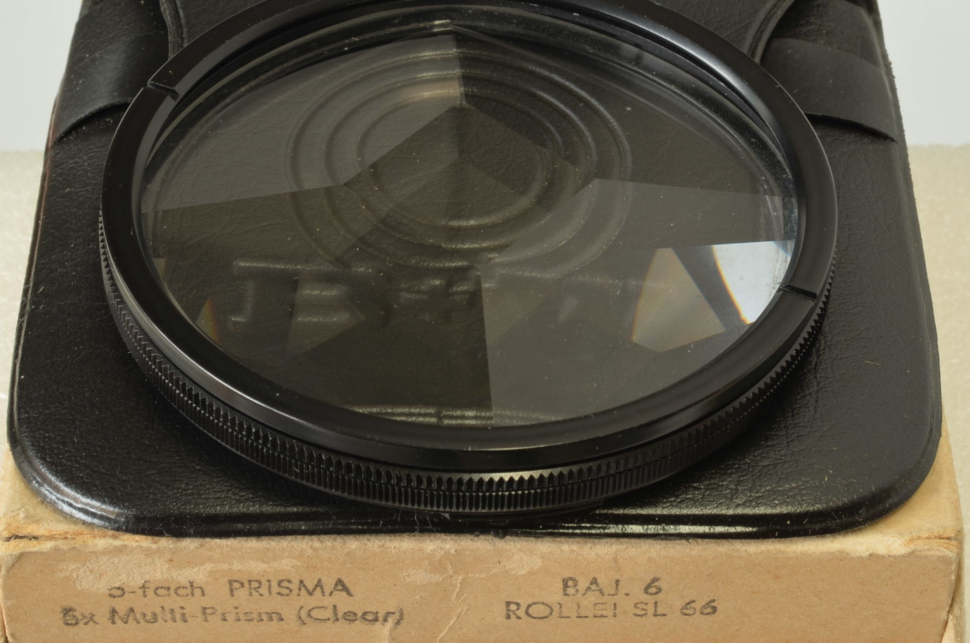 Filtro prismatico a 5 facce che moltiplica il soggetto centrale circondandolo con altre 4 repliche speculari. Ideale per effetti caleidoscopici. Dedicato a Rollei SL66, serie 6000, etc. Come nuovo.