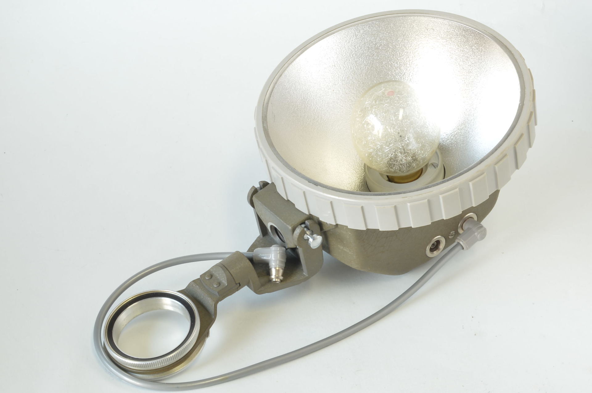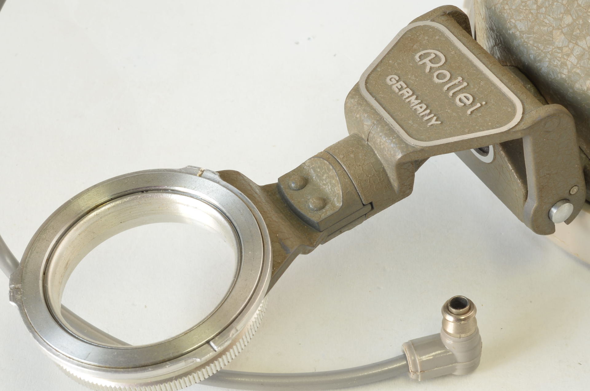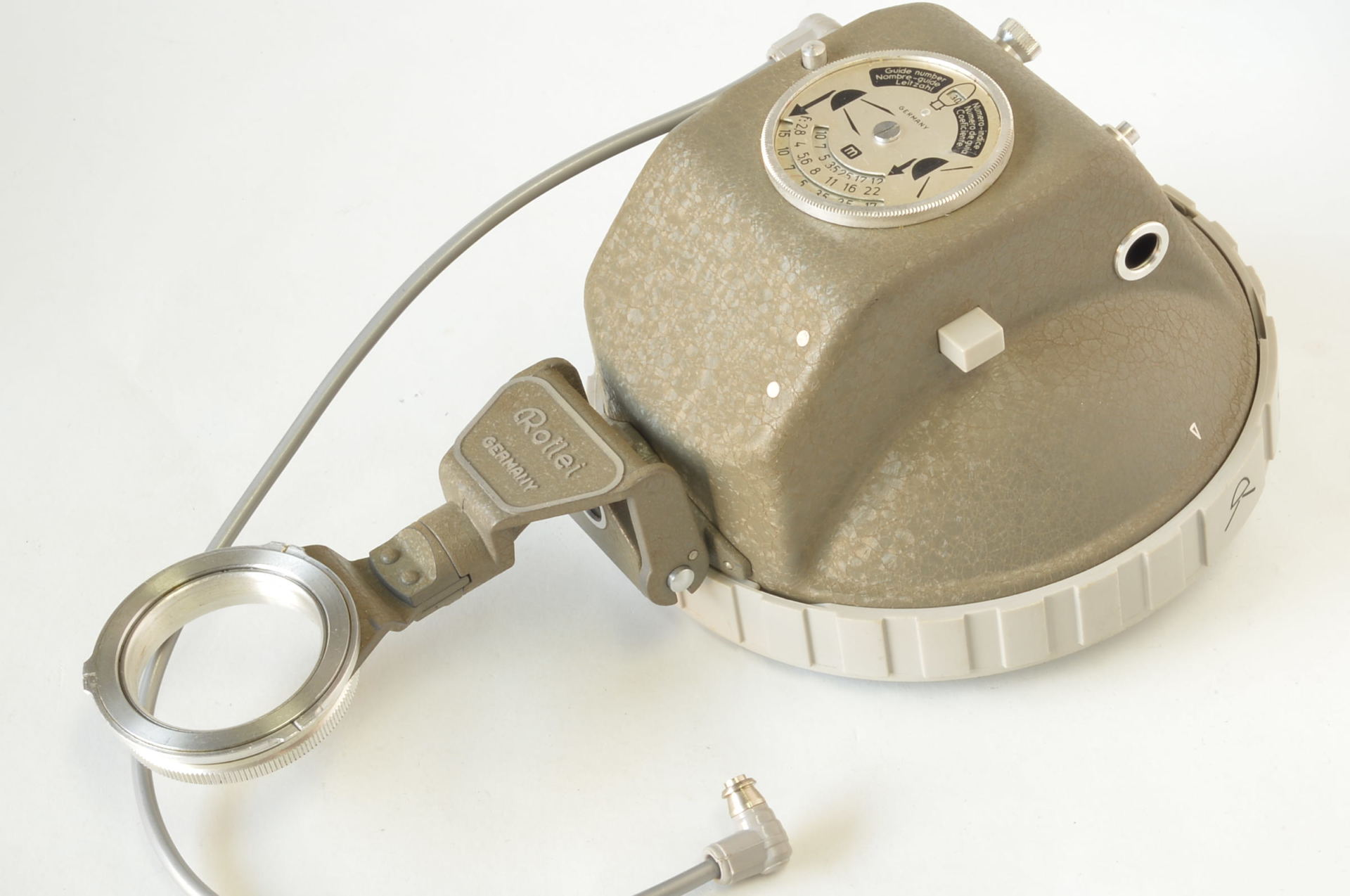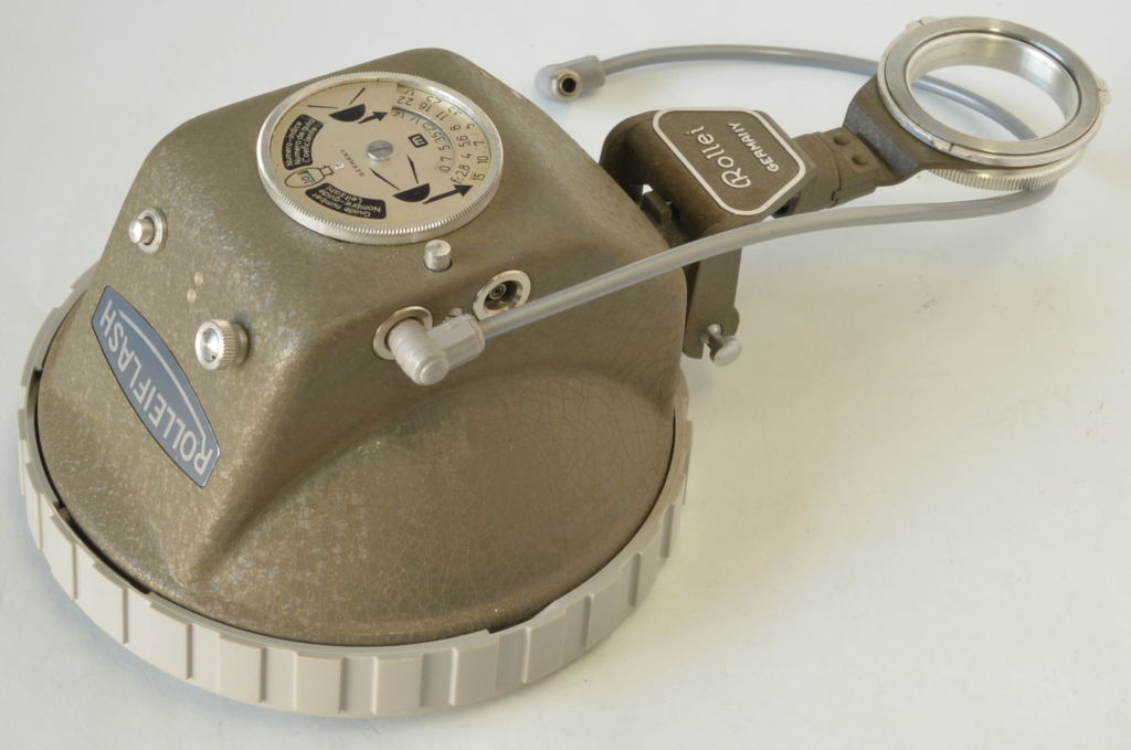 Rolleiflash nella particolare finitura Grigio Martellato. Prodotto dalla Franke & Heidecke in Germania, questo modello è stato progettato per abbinarsi esteticamente alle fotocamere Rolleiflex di colore grigio (come la celebre Baby Rollei 4×4 o la Rolleiflex T Grey), ma è meccanicamente compatibile con gli attacchi a baionetta Rollei standard. A differenza del modello base, questa versione è dotata sul retro di un calcolatore di esposizione analogico (ghiera mobile) per determinare rapidamente il diaframma corretto in base alla distanza e alla pellicola. Molto bello, completo di lampada inutilizzata.