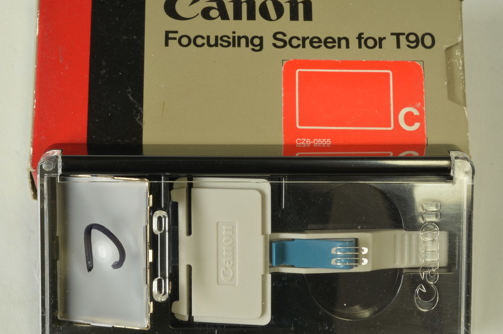 Schermo di messa a fuoco originale Canon, specifico per la fotocamera reflex Canon T90. La dicitura “Tipo C” indica che si tratta di uno schermo interamente smerigliato (Matte) con un cerchio di riferimento centrale, ma senza stigmometro spezzato o microprismi al centro. Completo di scatola originale.
