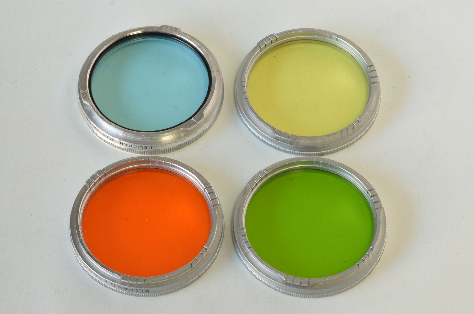 Set di 4 filtri composto da un Heliopan II/3.5 2x LW-1 blu chiaro, un Kelpan G2 / RA 3.5 verde, un Kelpan 0 / RA 3.5 arancione e un Kelpan Y1 /RA 3.5 giallo chiaro. Tutti e 4 i filtri sono dedicati alle fotocamere Rolleiflex 3.5 F. In buonissime condizioni.