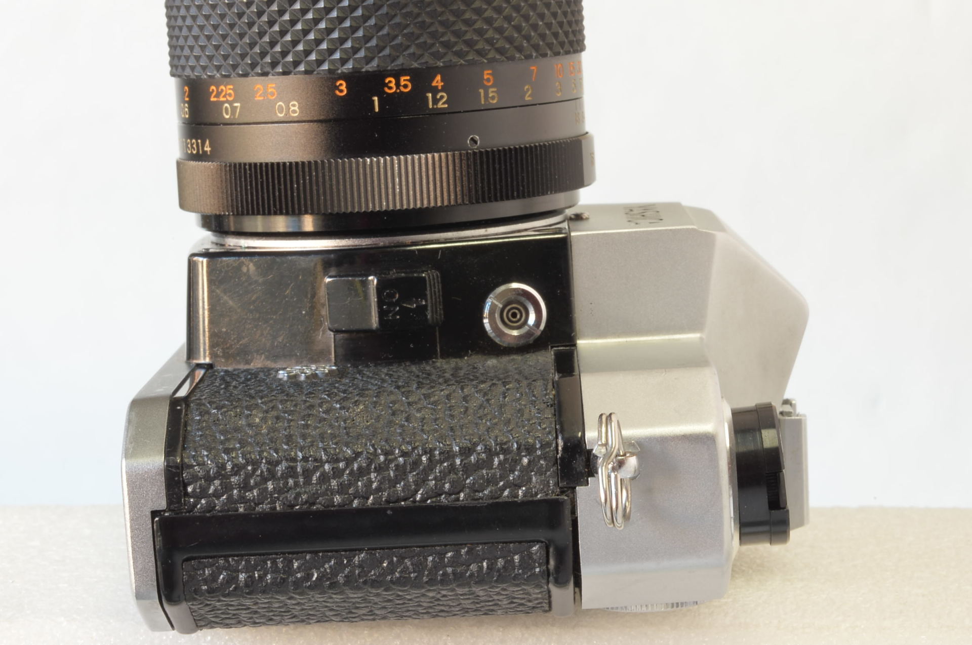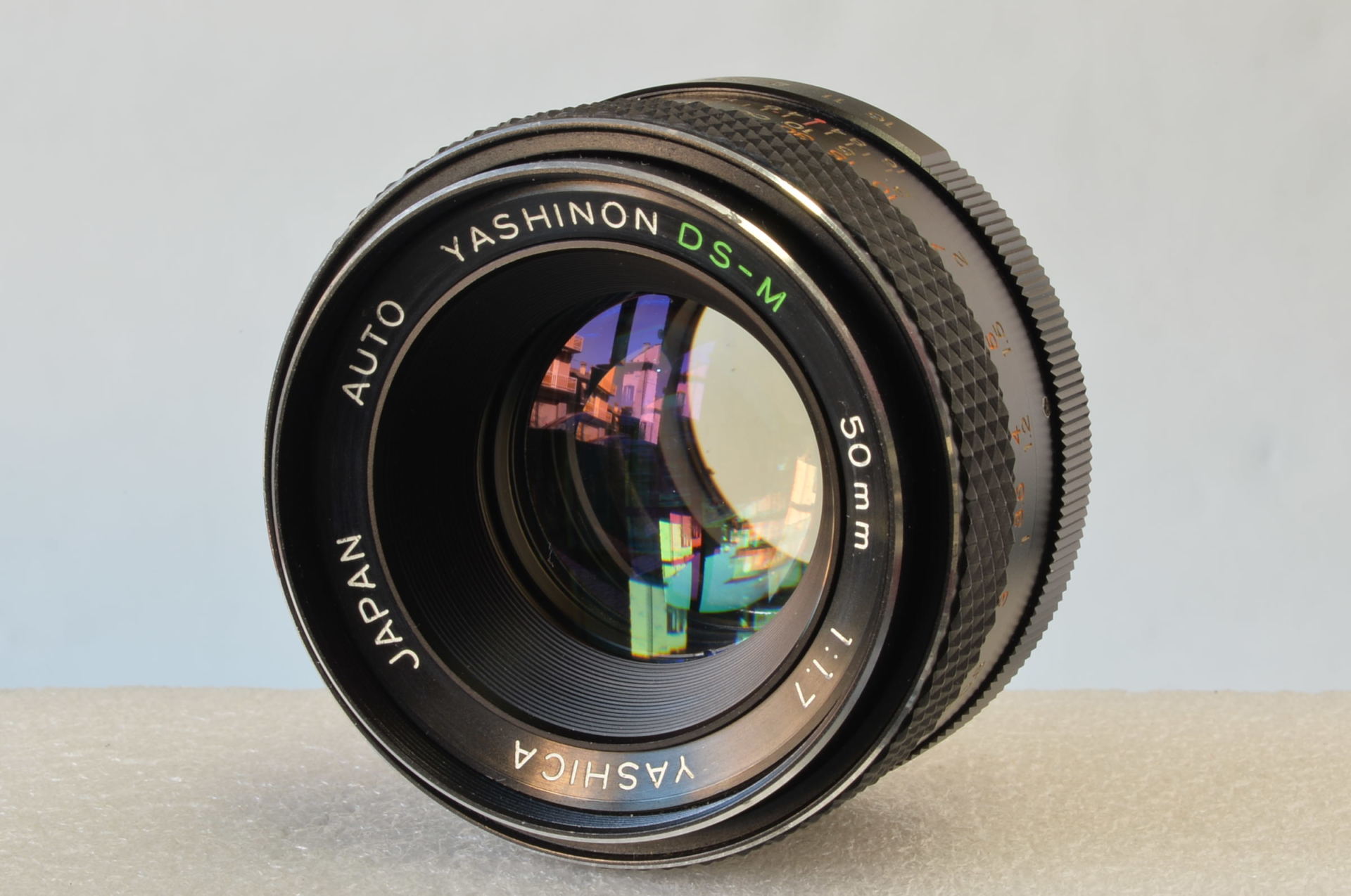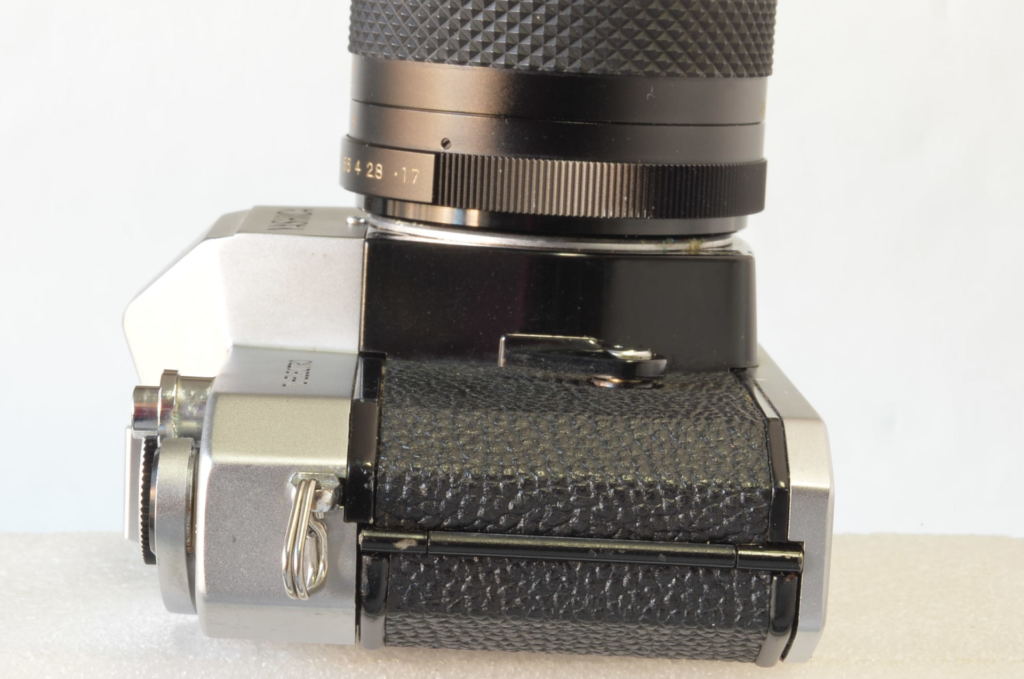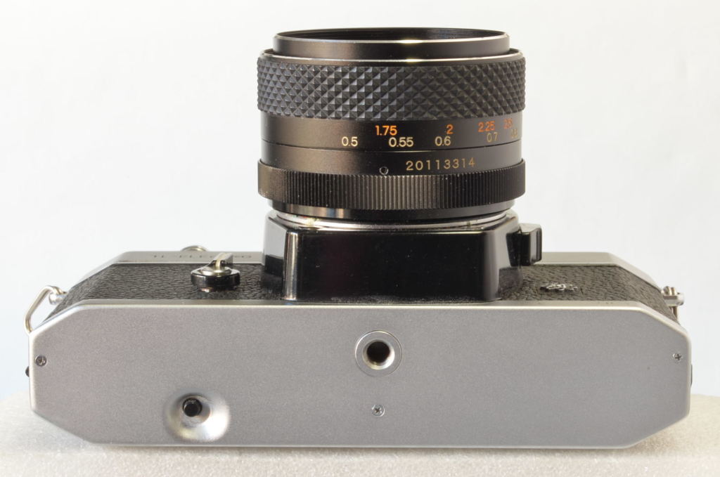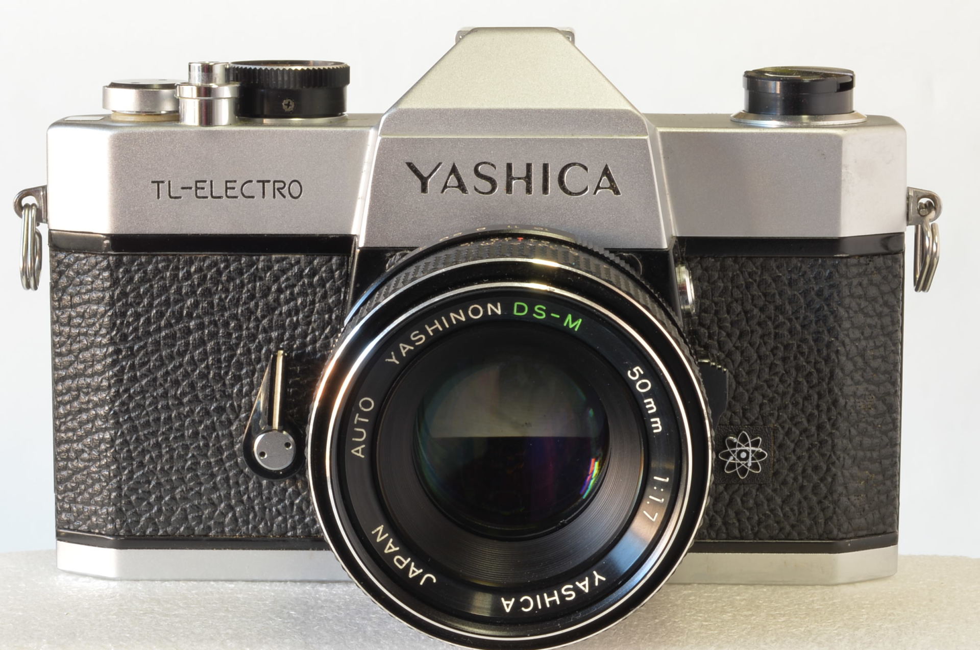Fotocamera reflex analogica (SLR) 35mm prodotta dalla giapponese Yashica all’inizio degli anni Settanta, nota per il suo otturatore con gestione elettronica e gli indicatori luminosi per l’esposizione nel mirino (simboleggiati dal logo “atomico” sulla destra del corpo macchina). Monta un obiettivo Yashinon DS-M 50mm f/1.7. La sigla “DS-M” indica che è un obiettivo con trattamento multistrato (multi-coated) di alta qualità. L’attacco è a vite M42 (passo universale), molto comune all’epoca. Manca la piastrina numerata di copertura della ghiera dei tempi.